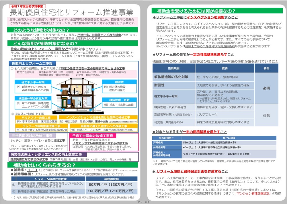各種補助制度の詳細を知りたい方はこちら⇒住宅:住宅リフォームの支援制度 ※令和7年6月2日時点 - 国土交通省